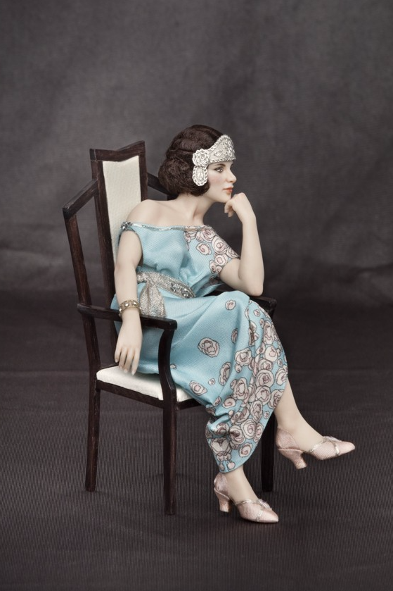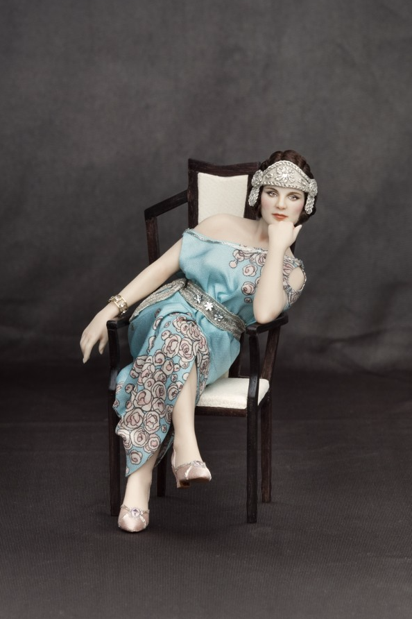 Sandra: woman from 1920’s in cocktail costume. The silk taffeta print is inspired by illustrations of George Barbier. Hand embroidered tiara. Silk shoes decorated with little cameos. Art Deco chair replica by Cristina Noriega.