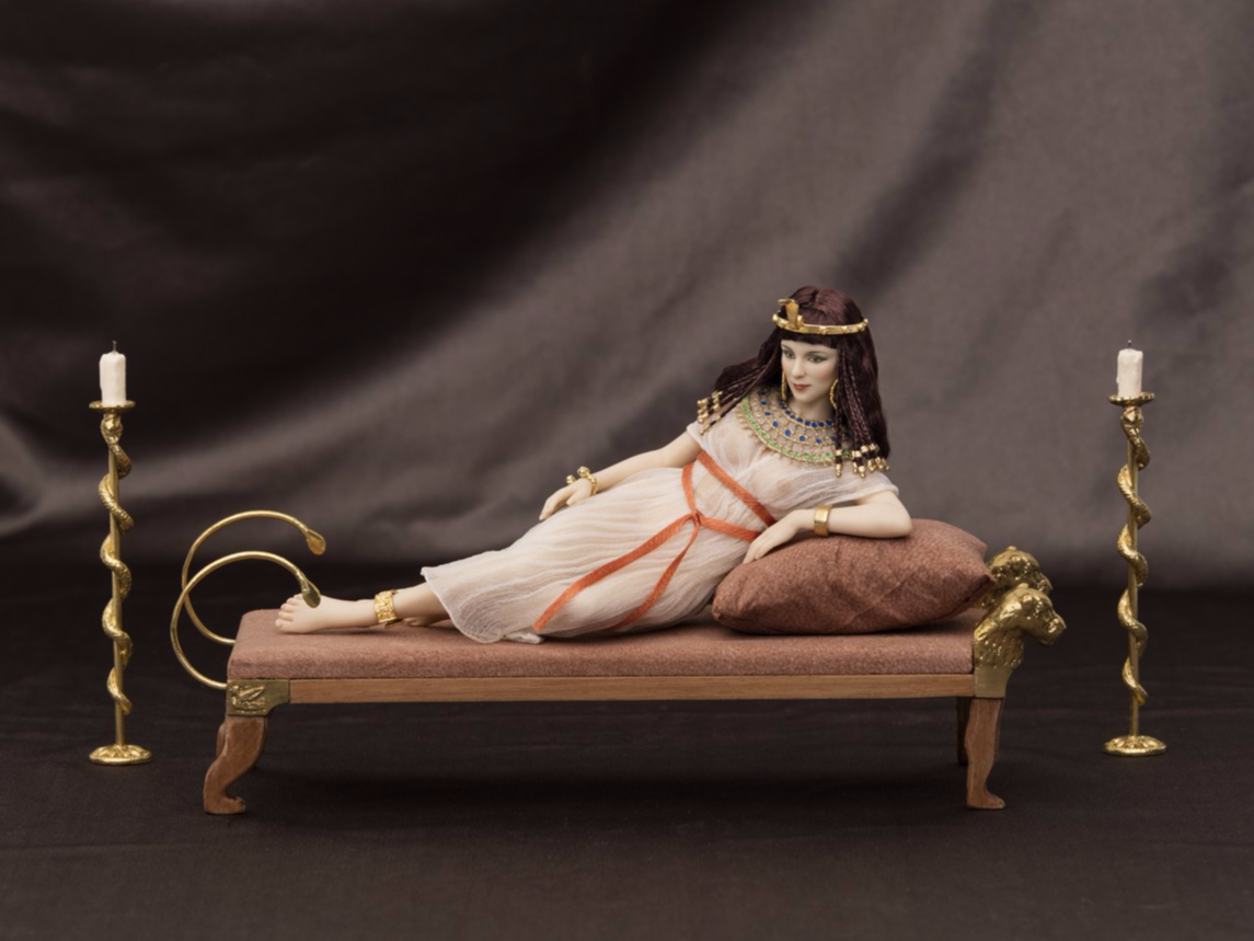 Cleopatra: The doll is dressed in an Ancient Egypt costume (pleated and draped linen skirt and cape, pectoral collar, uraeus circlet -tiara with cobra-, elaborated hairdo with braids). She wears gold plated silver jewelry. The divan and chandeliers were made by the Spanish artisan Cristina Noriega in wood and bronze (the bed is a replica of the divan in the painting "The death of Cleopatra" by the pre-raphaelite artist John Maler Collier, inspired in Tutankhamun's treasure).