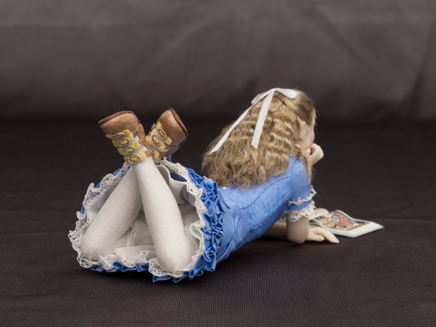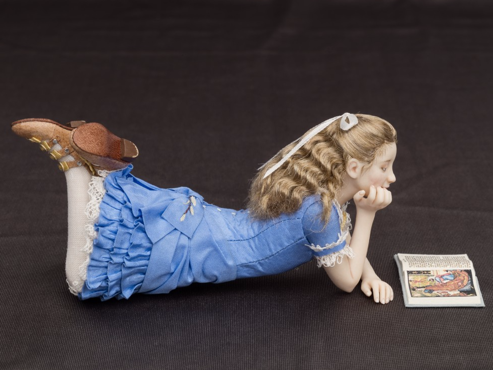 Noa: 9 years old girl from the decade of 1870’s in a blue taffeta dress. Leather open-front boots with buckles. She is reading “Beauty and the beast”.