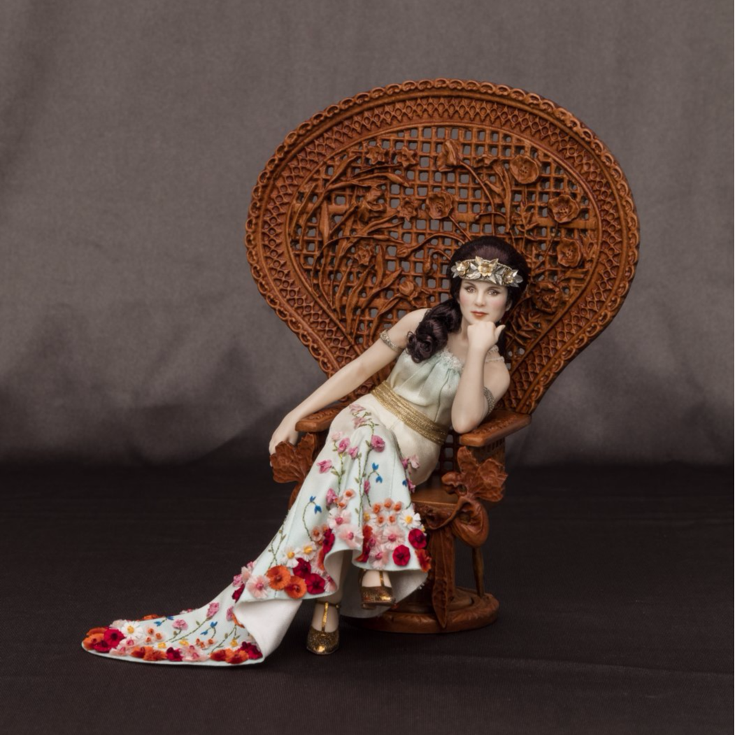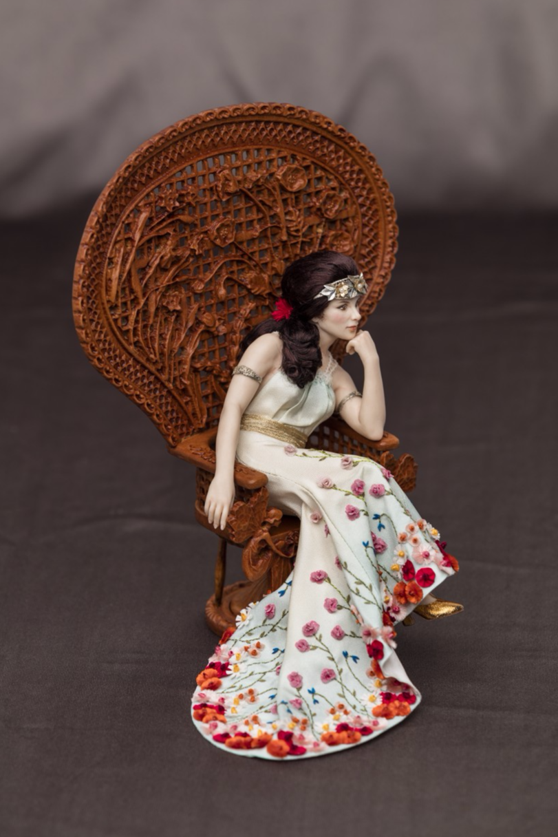 The doll is a porcelain figure in a fantasy costume made out of taffeta silk, trimmed with silk embroideries and appliques of flowers. Her siren-shaped gown, late Art Deco Style, consists of a bias-cut skirt and a halter neck blouse. The background color of the dress, a fade between white and ice blue, symbolizes the winter and it’s sprinkled at the skirt bottom with colorful flowers that signal the arrival of the Spring, climbing up and filling with color the pale shades of the winter: poppies, roses, gerbera flowers, daisies, bellflowers, cherry blossoms and green leaves; a total of 400 hand-made appliques made out of silk with different textures of shine.