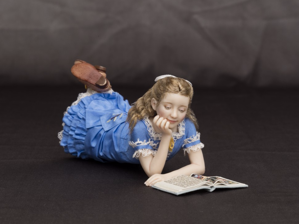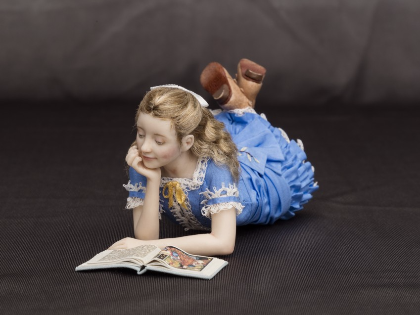 Noa: 9 years old girl from the decade of 1870’s in a blue taffeta dress. Leather open-front boots with buckles. She is reading “Beauty and the beast”.